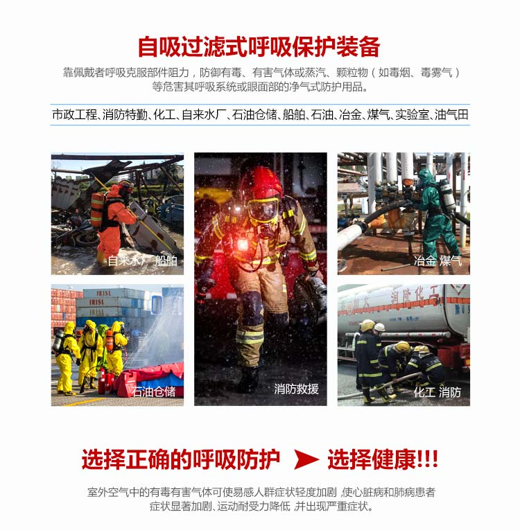 適用范圍:適合在有毒有害氣體污染環(huán)境、或缺氧窒息性災(zāi)害發(fā)生時(shí)使用,例如礦山自救逃生、高層樓宇逃生等,同時(shí)也可在石油化工、隧道工程等。