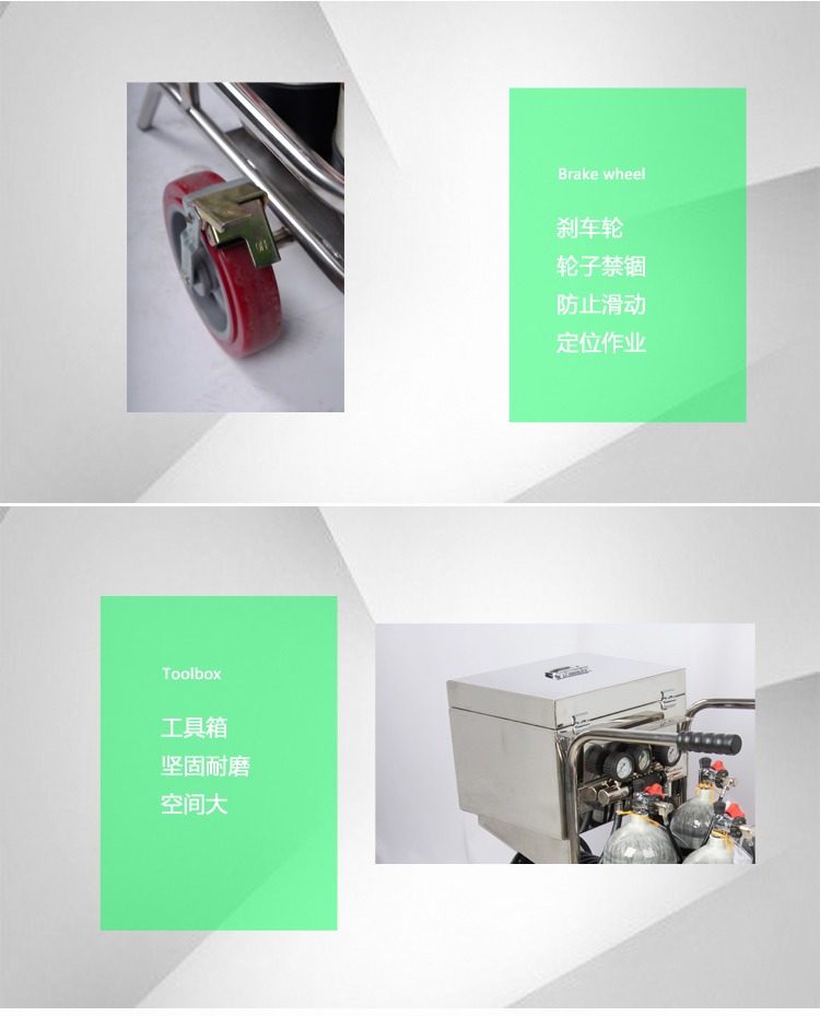 | 產(chǎn)品特點(diǎn): | 氣瓶可工作中逐個(gè)更換,提供不間斷供氣;雙減壓器設(shè)計(jì),供氣量穩(wěn)定充足;堅(jiān)固耐腐蝕,304不銹鋼材質(zhì)的車架與配件箱;移動(dòng)便利,前面安裝2個(gè)萬(wàn)向輪,后面安裝2個(gè)定向輪,車體推動(dòng)方便省力;車身停放穩(wěn)固,前后車輪都配有剎車裝置,防止車體自行移動(dòng)。 |